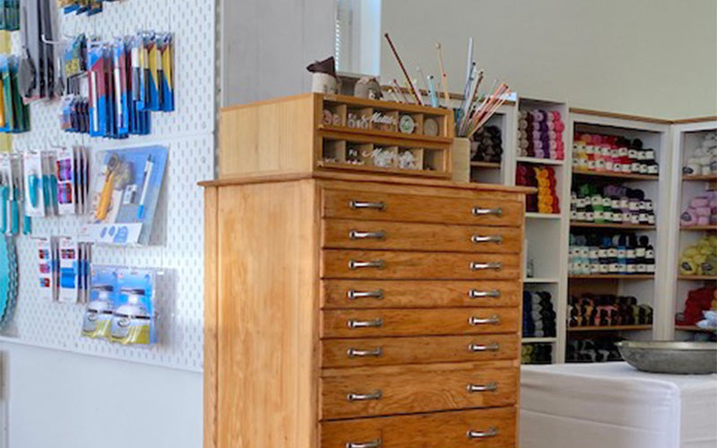 Schau auch in unser Prunkstück: Der grosse Schubladenstock mit Näh- und Strickzubehör aller Art aus unserem privaten Fundus steckt voller Überraschungen! Du findest darin garantiert den passenden Knopf, Druckknopf, Perlen, die passenden Nadeln und Vieles mehr.