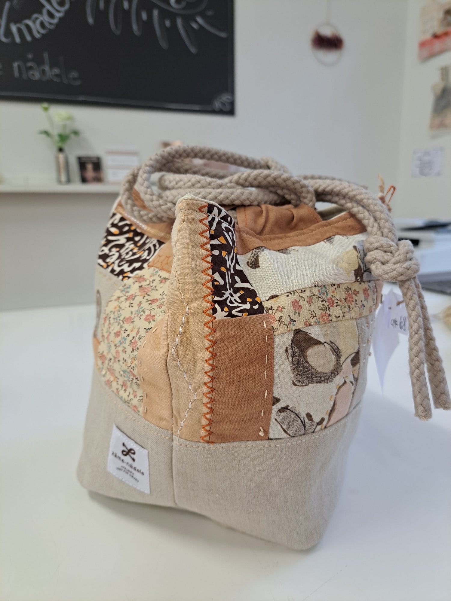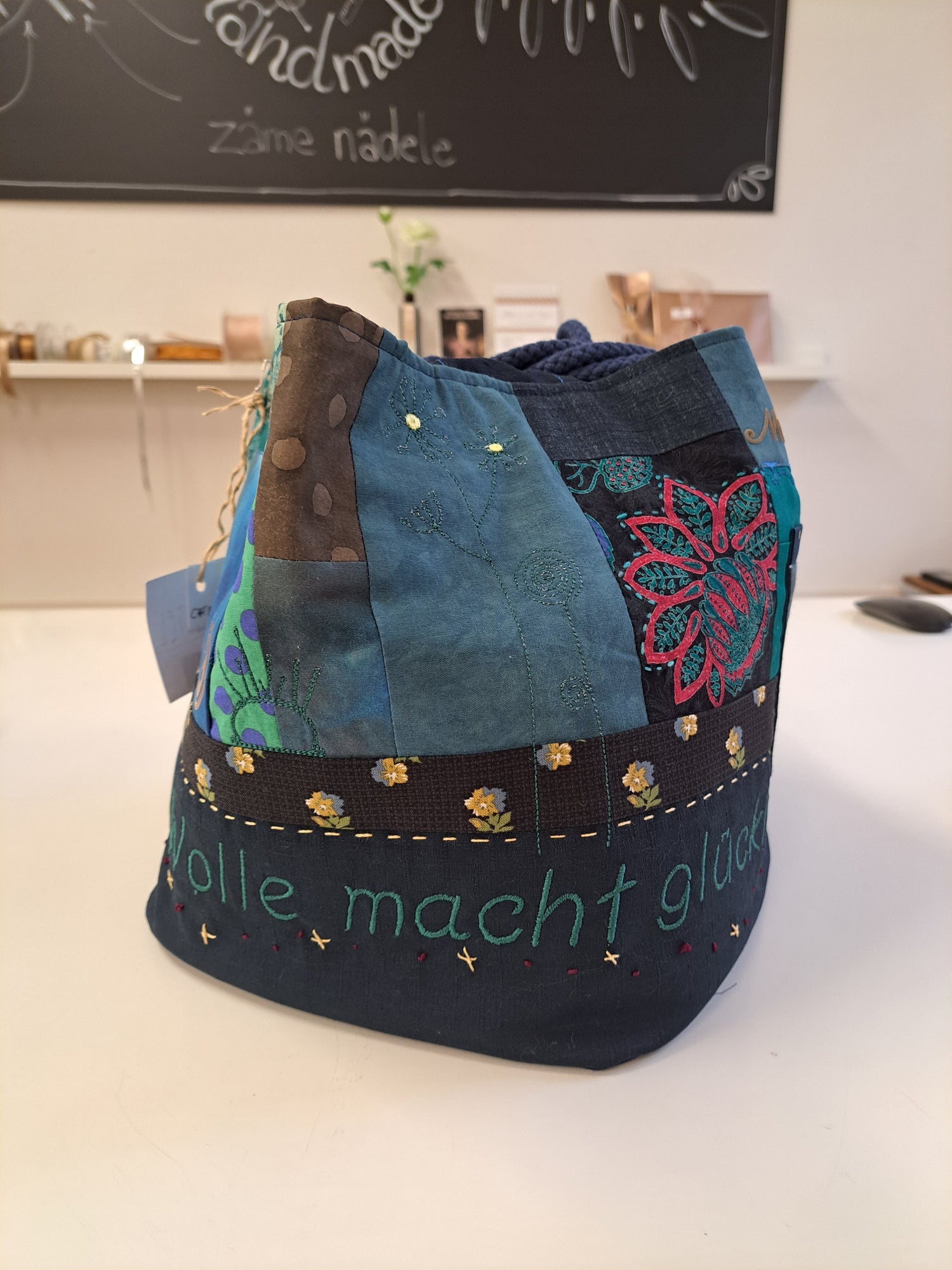 Unsere komplett handgemachten Beutel sind aus Baumwoll- Samt- und Seidenstoffen und besitzen Aussen- und Innentaschen. Der Beutel wird mit einer Kordel geschlossen. Jedes Stück ist ein Unikat.